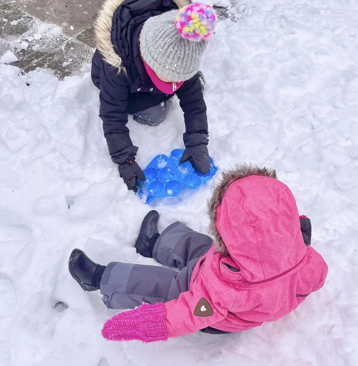 Scooping snow into buckets with smaller cups until they’re full (competitive kids + 2 large buckets = at least a coffee break for mom)